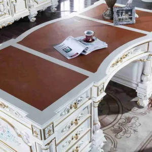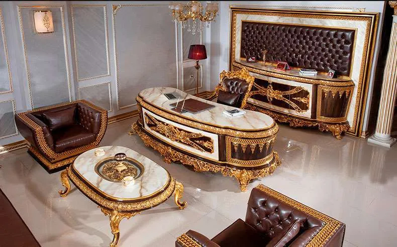 Transform your office into a realm of sophistication with our stunning luxury boss office tables. Each table is meticulously crafted from a robust hardwood frame, ensuring durability and timeless beauty. The exquisite hand-carving showcases the artistry that goes into every piece, while the elegant gold leaf accents add a touch of opulence that is sure to impress. Imagine the confidence you’ll feel sitting at this magnificent table, where every detail speaks of quality and refinement. Whether you’re hosting meetings or working on important projects, this luxury desk will elevate your workspace to new heights.