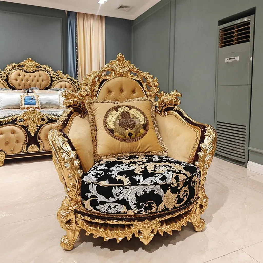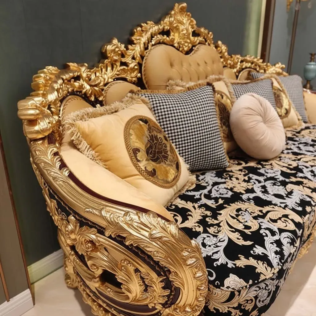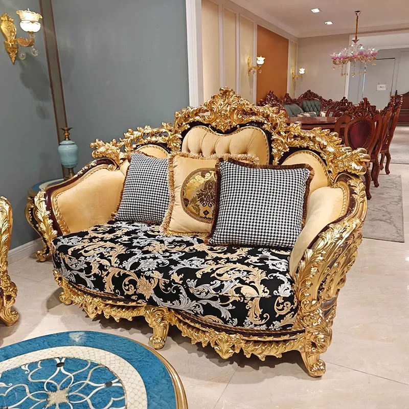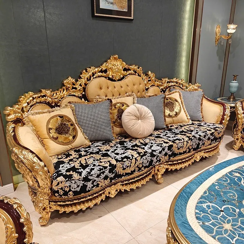 ndulge in the finest European style furniture that promises both visual splendor and enduring quality. Every curve and flourish of this magnificent gold carved sofa and armchair speaks volumes about its superior craftsmanship. The sturdy wooden frame, adorned with dazzling gold leaf accents, ensures longevity and stability, making it a wise investment for your elegant abode. The rich, soft fabric is not only a feast for the eyes but also incredibly comfortable, making it the ideal centerpiece for entertaining guests or simply unwinding in style. Whether you’re furnishing a grand parlor or a sophisticated family room, this luxury sofa set, including a matching carved coffee table and accent tables with beautiful blue inlay, will be the crown jewel of your interior design, reflecting your impeccable taste in high-end furniture.